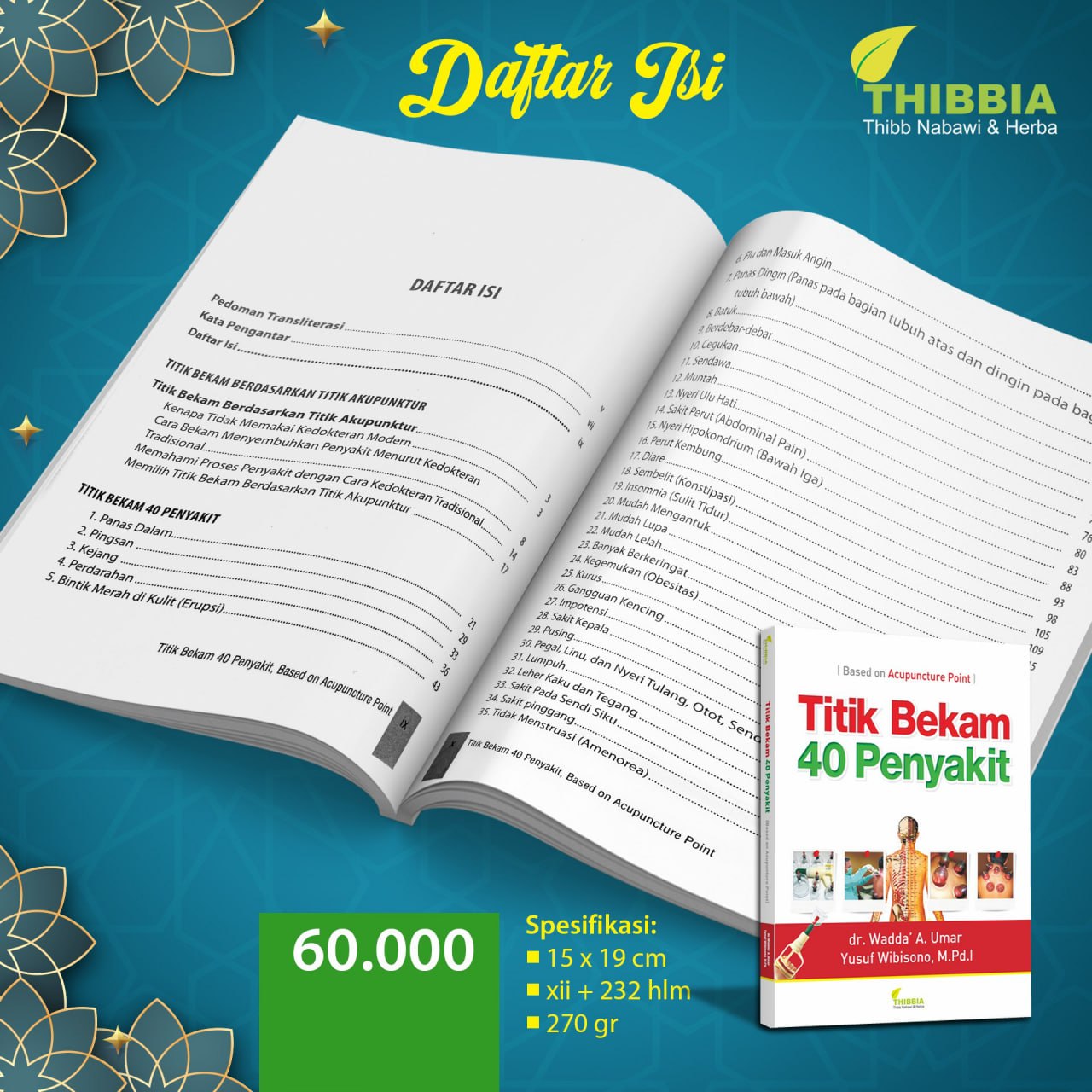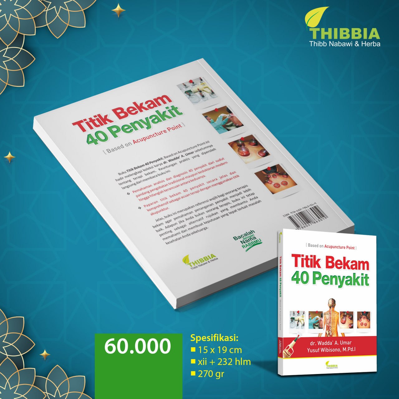 Buku Titik Bekam 40 penyakit, Based on acupunture Point ini hadir melengkapi koleksi karya dr.Wadda’ A.Umar sebelumnya tentang terapi bekam. Keuntungan praktis yang di peroleh langsung dari membaca buku ini :