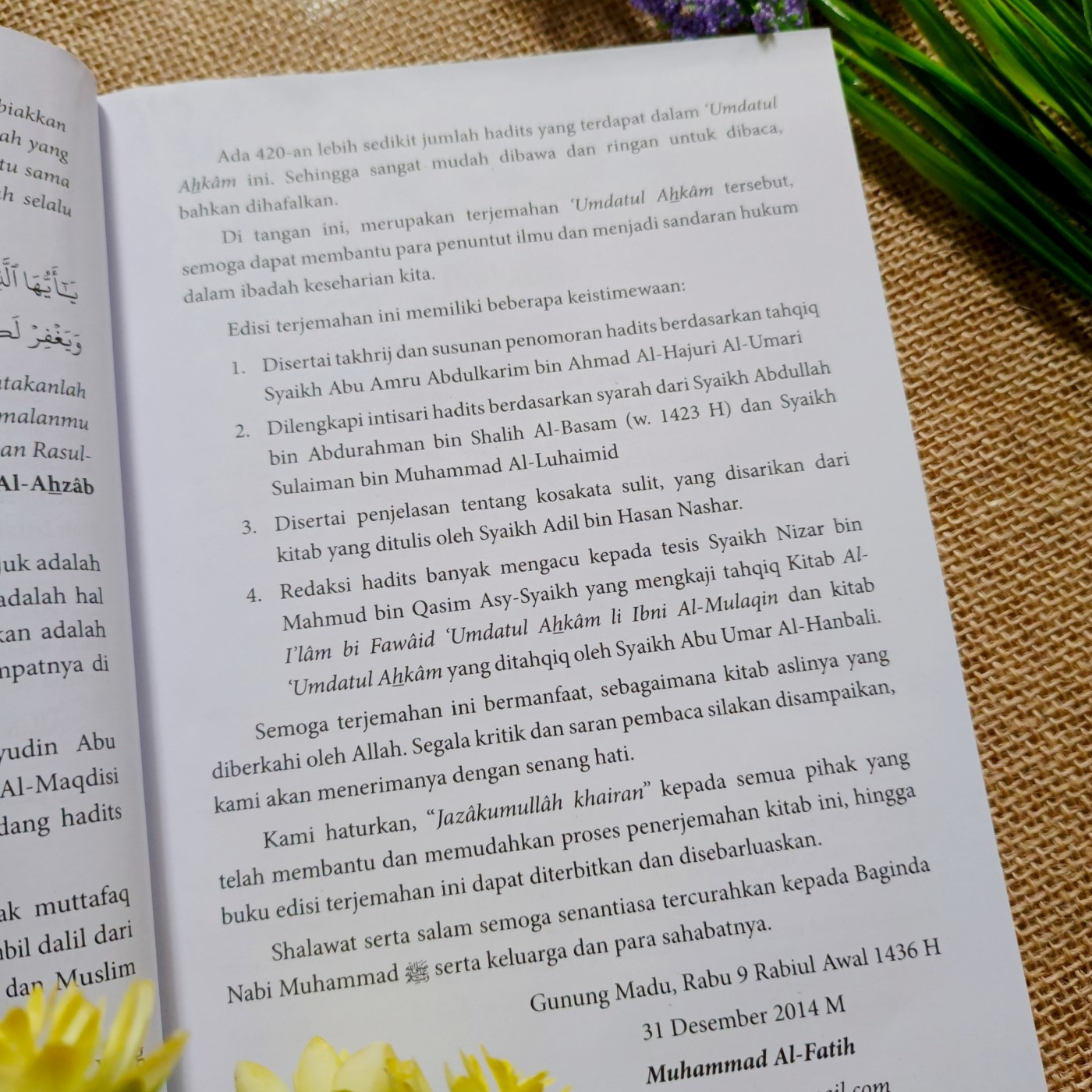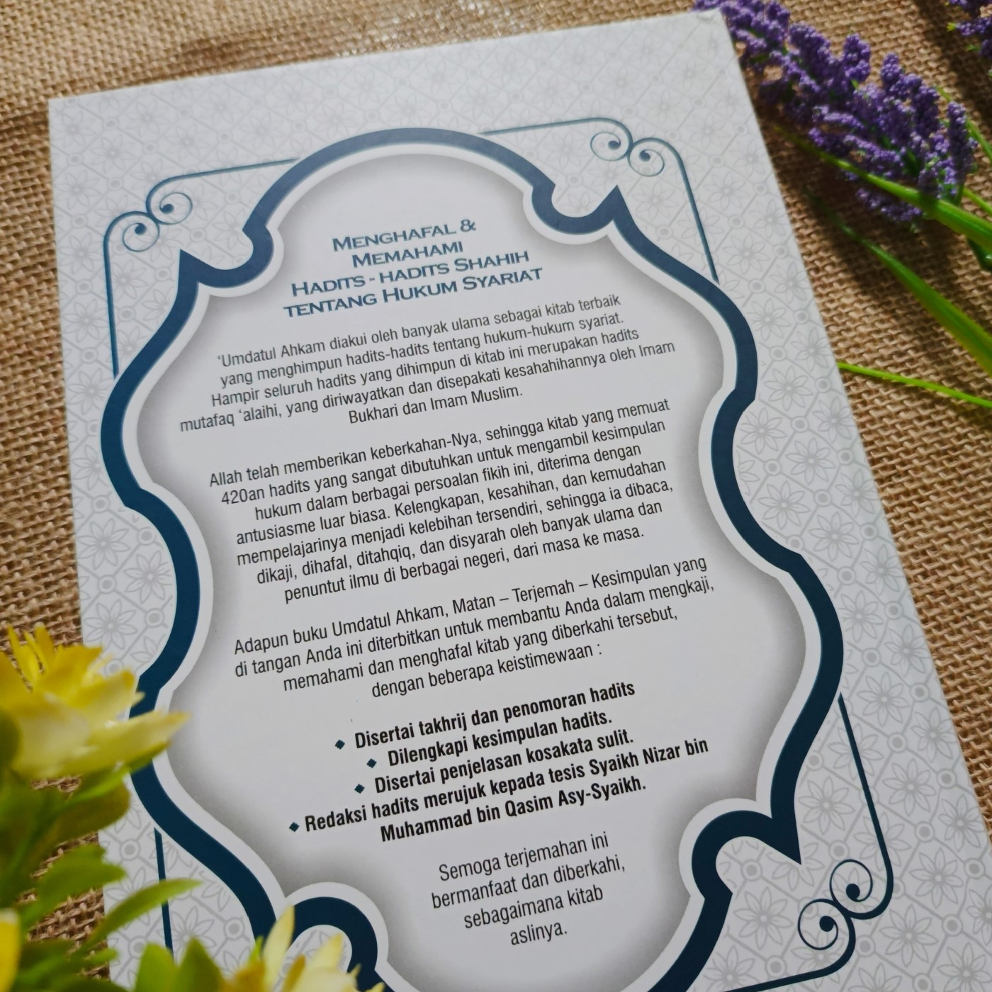 Adapun buku Umdatul Ahkam, Matan-Terjemahan-kesimpulan yang di tangan Anda ini diterbitkan untuk membantu Anda dalam mengkaji, memahami dan menghafal kitab yang diberkahi tesebut, dengan beberapa keistimewaan :